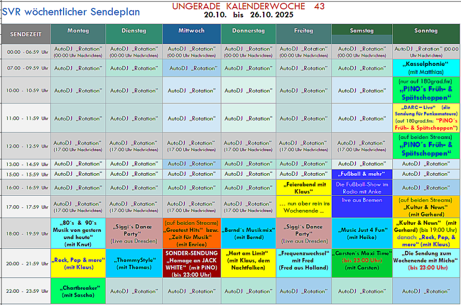 SENDEPLAN FÜR DIE KALENDERWOCHE 43/2025 (SVR Hanseradio ... inkl. 180grad.fm)